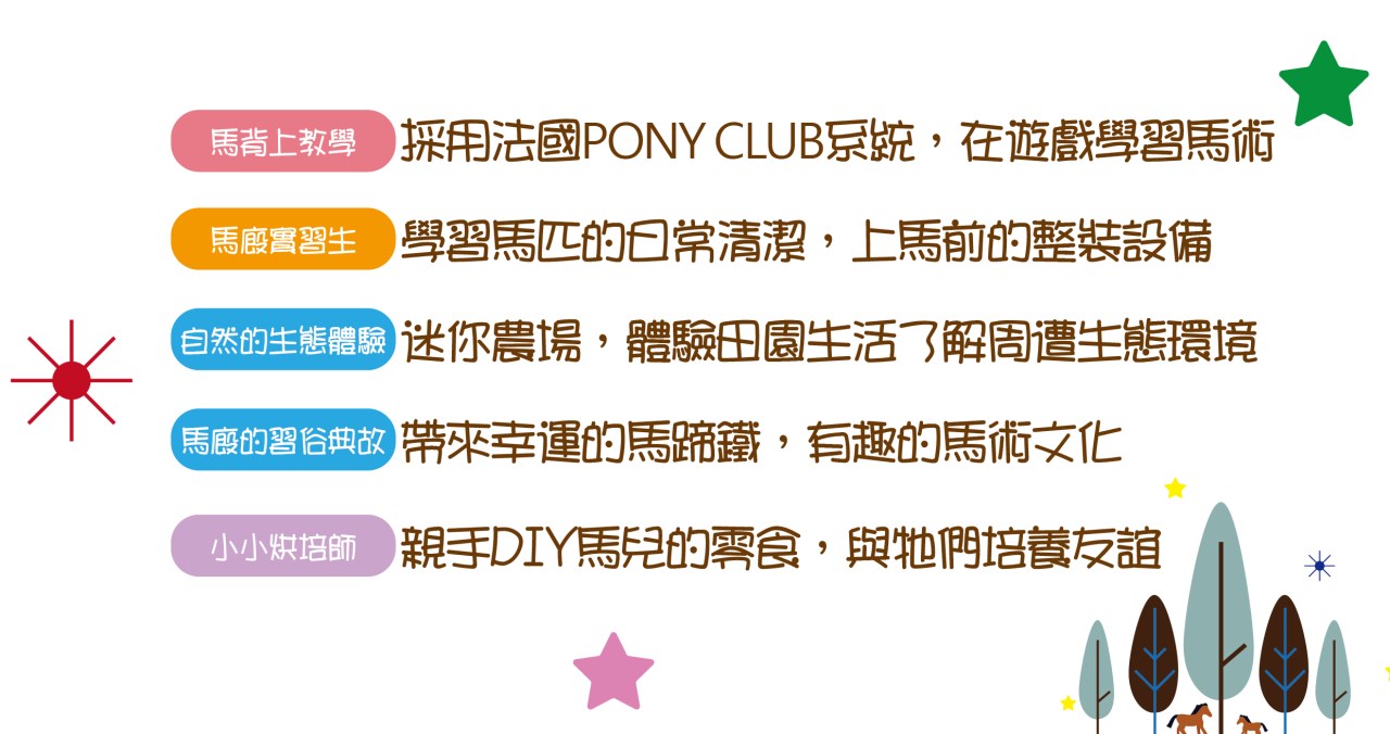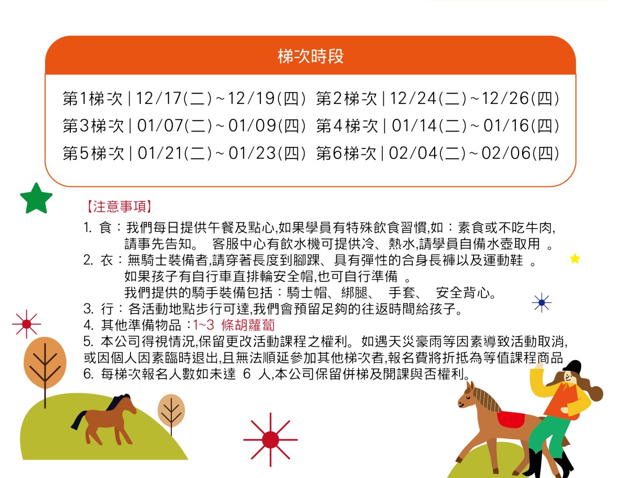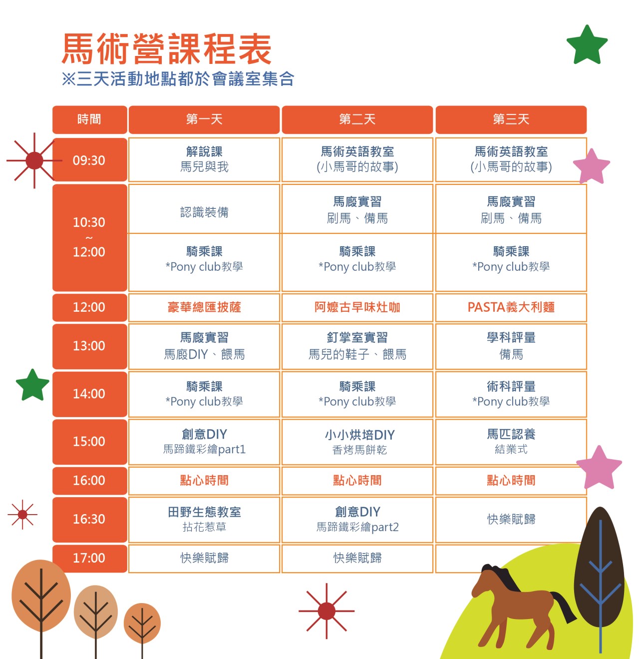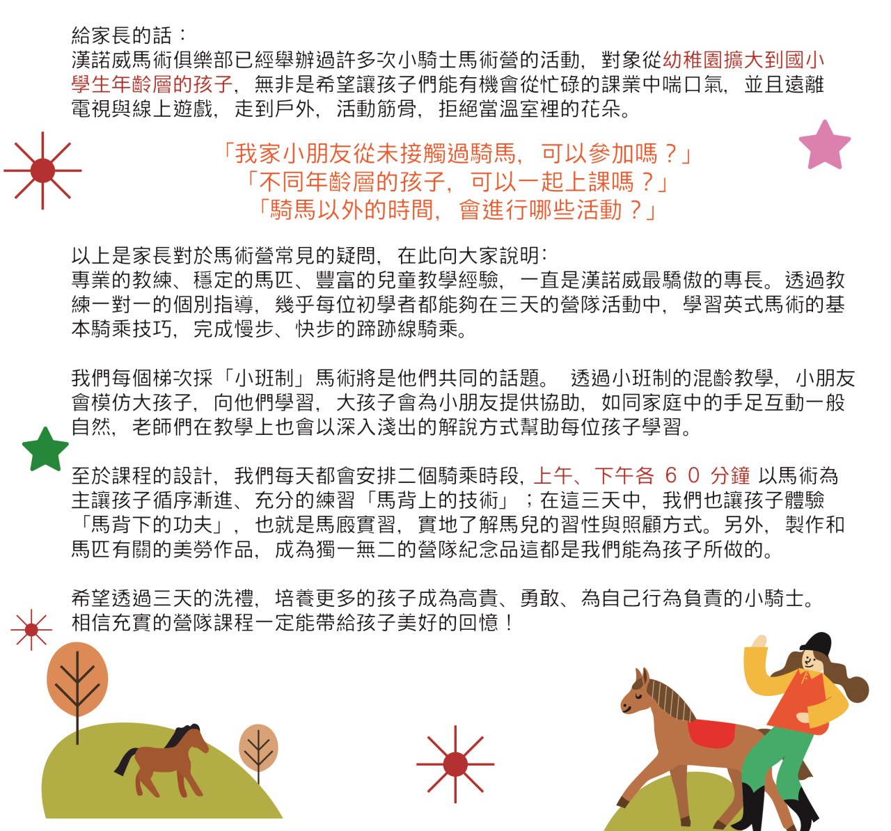 ■活動地點:漢諾威馬術俱樂部(台北市承德路七段143號之1,近石牌路口) ■招收對象:3歲以上,歡迎親子 ■報名方式: > 線上報名 >傳真報名表至02-2823-5295 >E-mail報名表至 [email protected] >Lind官方ID:@h28233763 (傳真或E-Mail請於下方下載簡章,並於三日內支付費用始確認報名,額滿為止) ■活動費用: 活動詳情請洽詢02-2820-2272或客服部02-2823-3763 ■活動/報名簡章:簡章下載 ▲小小馬術競賽體驗比賽 ▲分組教學,互相扶持 ▲馬廄實習-洗馬