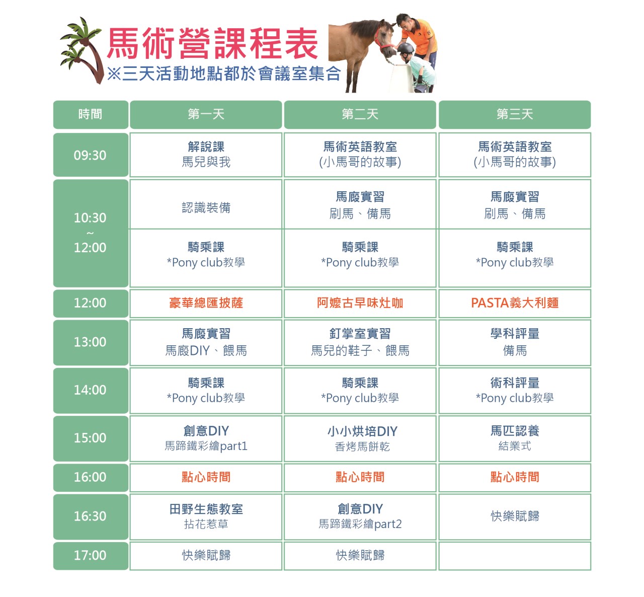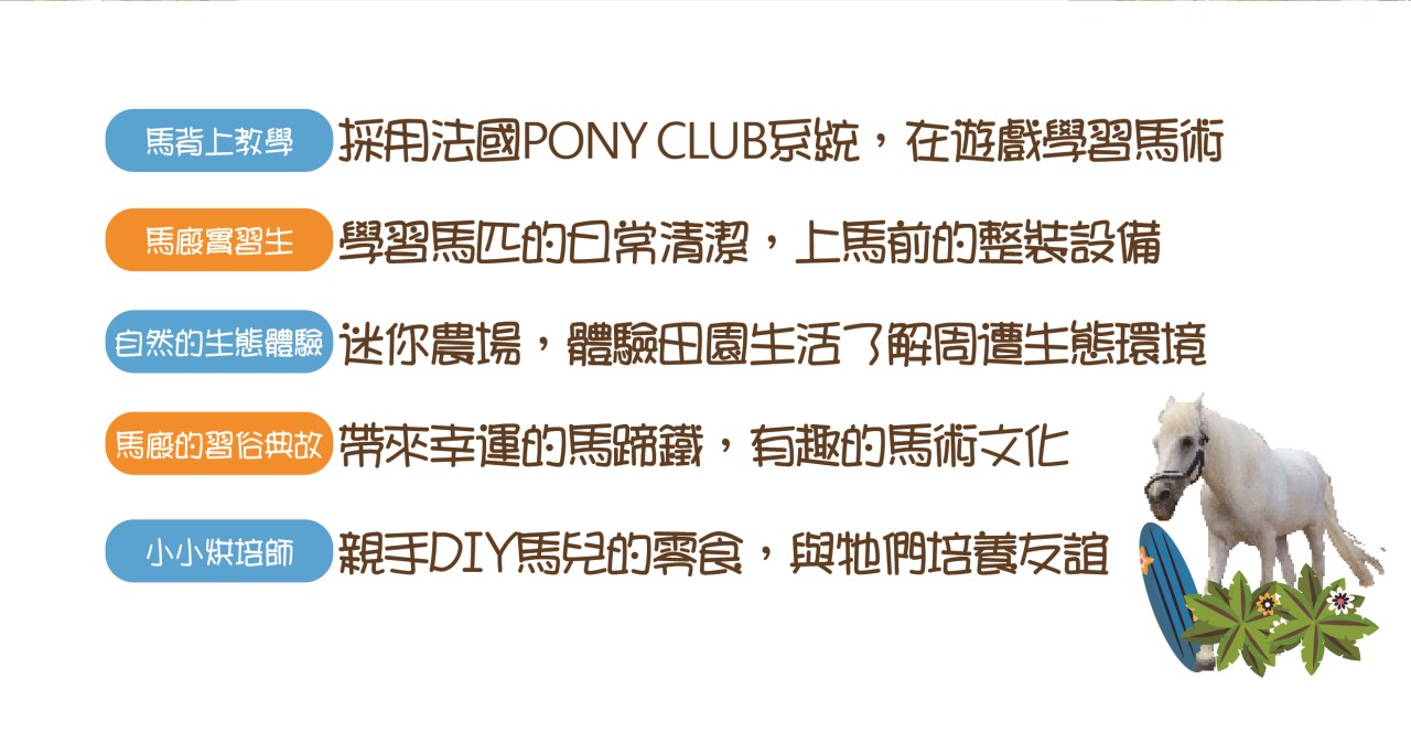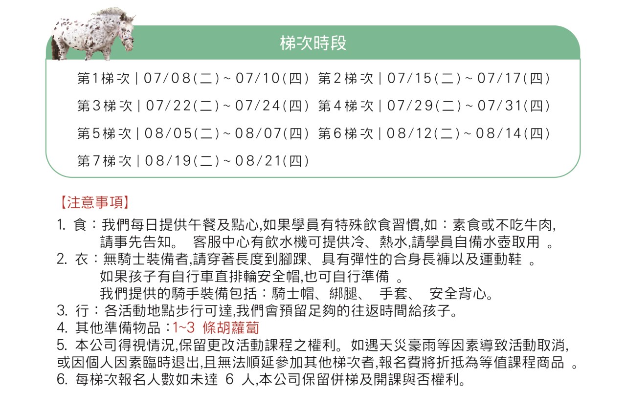 「我家小朋友從未接觸過騎馬,可以參加嗎?」 這是家長對於馬術營常見的疑問,在此向大家說明: 第二,我們每個梯次採「小班制」馬術將是他們共同的話題。 透過小班制的混齡教學,小朋友會模仿大孩子,向他們學習,大孩子會為小朋友提供協助,如同家庭中的手足互動一般自然,老師們在教學上也會以深入淺出的解說方式幫助每位孩子學習。 希望透過三天的洗禮,培養更多的孩子成為高貴、勇敢、為自己行為負責的小騎士。 希望透過三天的洗禮,培養更多的孩子成為高貴、勇敢、為自己行為負責的小騎士。相信充實的營隊課程一定能帶給孩子美好的回憶! ■活動地點:漢諾威馬術俱樂部 (台北市承德路七段143之1號,近石牌路口)